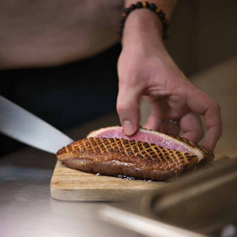 Notre cuisine, à la fois inventive et ancrée dans le terroir, met à l’honneur des produits locaux sublimés par une multitude d’inspirations. Parfois traditionnelle, avec notre touche unique – comme le poulet rôti au foin ou l’omelette charcutière –, parfois marquée par des influences asiatiques, comme nos aiguillettes de canard accompagnées d’une sauce aigre-douce à la menthe. Elle sait aussi surprendre en osant des associations inattendues : de la vanille avec du foie gras, du cacao pour sublimer le bœuf, ou encore du charbon et des champignons dans les desserts.